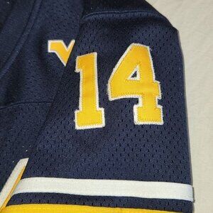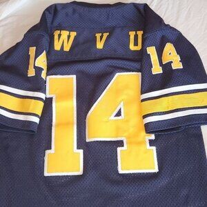 WEST VIRGINIA MOUNTAINEERS #14 YOUTH Football Sewn Jersey XL 20 Colosseum the tag at hip has much wear on one end as pictured. there is some wear to the stitching on one sleeve as pictured. ..youth xl 20 ..............