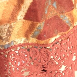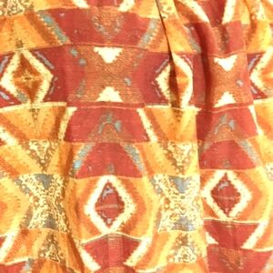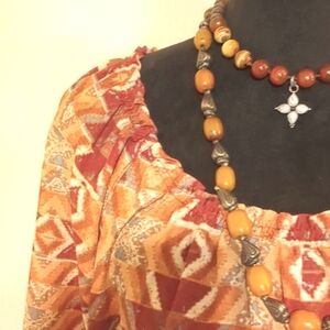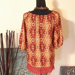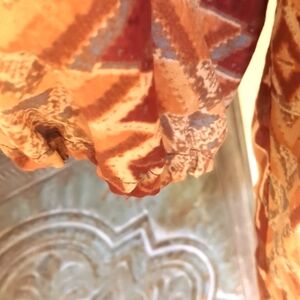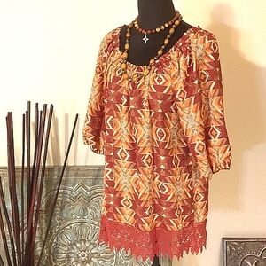 NWOT—-It’s a blend of Polyester and Cotton in vivid colors and design in multiple oranges and multiple tans. It measures about 18” inches from pit to pit and averages about 30” inches shoulder to lace hem. It can be worn as a top or as a dress
