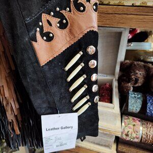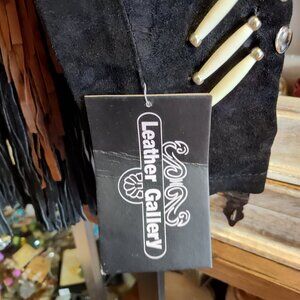 GORGEOUS LEATHER FASHION BLACK AND BROWN FRINGE JACKET SNAP CLOSURE WITH LOTS OF FRINGE CHOCOLATE BROWN AND BLACK BONE AND SILVER ACCENTS MAKE THIS SUPER SPECIAL FROM OUR BUTIQUE GLITZ 1478 ATWOOD AVENUE JOHNSTON RI