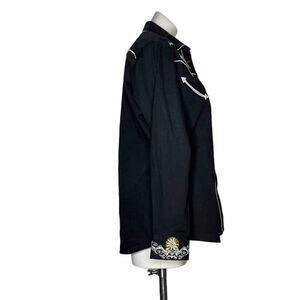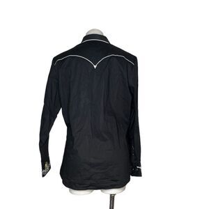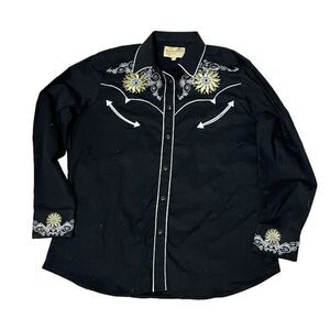 This is a fabulous western cowgirl shirt in black with white piping. Embroidery is white and yellow floral abstract print. Darling smile pockets with arrow points at the end. White embroidered yolk at the back also has the arrow point. Even the cuffs are beautifully embroidered. This is a real stunner. Gently worn with no apparent flaws.