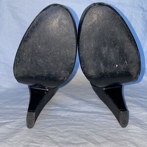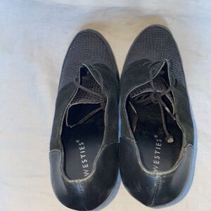 High heel Oxford with black leather and suede upper, snakeskin textured vamps and heel, round laces, 5” heel. Size 10.