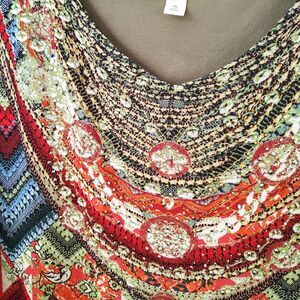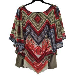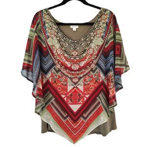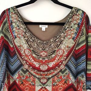 WESTPORT Boho Hippie Sheer Lined 1X Women's Plus Size Blouse Rhinestone Studded Jeweled Chest Design. Crew neck pullover shirt. Draping flowy sheer, multi-colored geometric, floral and paisley pattern on the outer layer, and a green solid-colored stretchy underlayer. 44" chest underlayer, 27" shoulder to hem. Compare to $60 new!