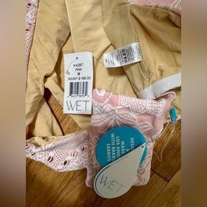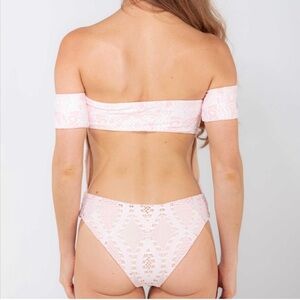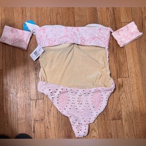 A playfully coquettish collection featuring true romantic lace and a classic baby pink hue. We're all heart eyes over here. A elegant shoulder baring one piece with a sweetheart neckline. Cold shoulder sleeves and a cutout in the back add a flirtatious touch. Cut from a supple blend of Brazilian fabric.