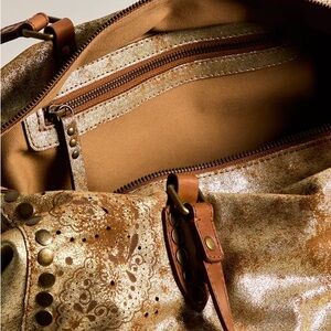 Effortlessly cool and so functional, this rustic tote bag is featured in a spacious, relaxed design with zipper closure, interior zipper compartment, and two handle options, all in a worn metallic leather fabrication with stud and paisley detailing.
