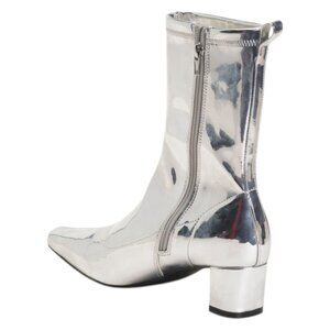 side zip closure, faux leather design, metallic design, pull on loop, low block heel, lightly cushioned footbed