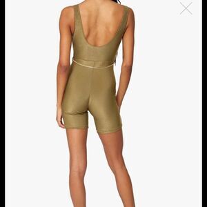 The Scoop Bodysuit is form-fitting in either a solid ribbed knit or brushed nylon. It’s detailed with a high waist seam and an optional chain belt featuring an engraved charm.