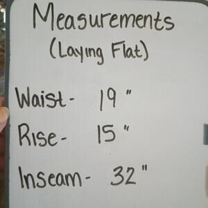 Measurements (laying flat) Waist- 19" (Full Waist- 38"); Rise- 15" (High Rise); Inseam- 32"
