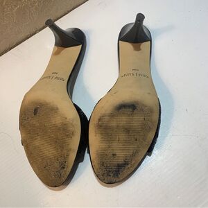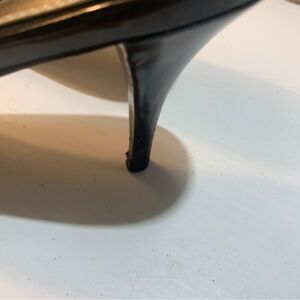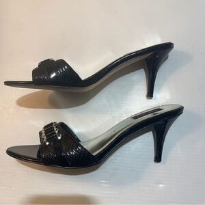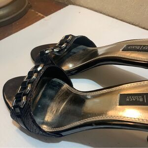 W H B M Black Patent High Heel Open Toe Sandals with Silver Accents