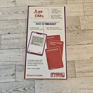 How To Play: Players rotate drawing a DM card while the rest of the group competes to play the funniest Play card. Once everyone has played their chosen Play card to submit face down, the rotating judge awards a point to the funniest one.