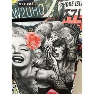 Unique graphic tee showcasing Marilyn Monroe with tattoo details and a striking license plate collage backdrop, this statement shirt is sure to turn heads. This crew neck t-shirt by WHATLEES features short sleeves and a vivid, all-over print that blends pop culture with edgy tattoo art. The design incorporates images of Marilyn Monroe alongside tattoo-style illustrations and a colorful array of license plate graphics. It is an eye-catching piece for those who appreciate bold and unconventional fashion.