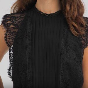 WHBM $200 Cap Sleeve Lace Detail Pleated Midi Dress Black 8 12