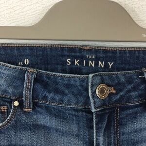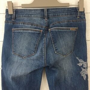 White lace appliqué on distressed skinny jeans. Popped detail on side seam.