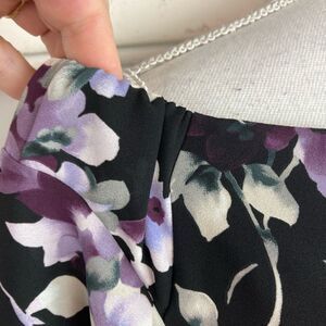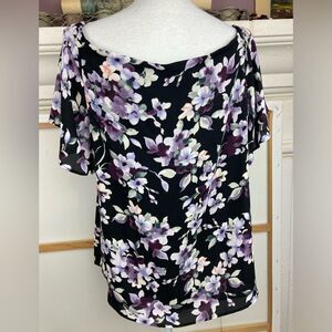 I love the dark background w/ purple and white flowers. Perfect beautiful new multi seasonFully lined. Elastic on shoulders to either sit better on shoulder or wear slightly off. Beautiful longer short flutter sleeve. Pit to pit 22” and shoulder to hem 25”. Wear 3 seasons dressy, formal,office, floral.