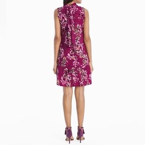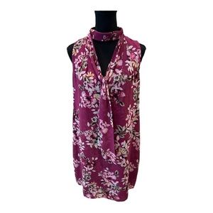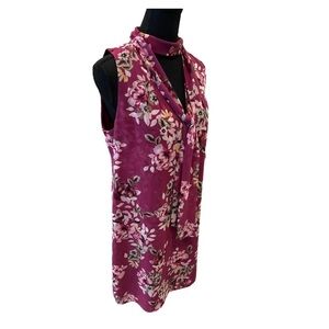 White House Black Market sleeveless choker V-neck shift dress in a berry bouquet print. Features a back exposed gold zipper closure. The choker ties in the back with a hook and eye closure at the back of the neck. Woven lining.
