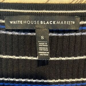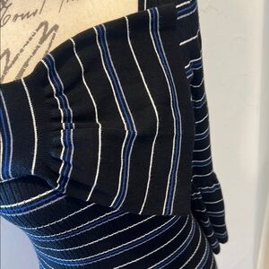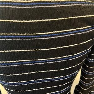 Stylish black blue and white striped sweater top with a flattering V-neck and elegant bell sleeves. Perfect for any occasion.