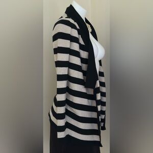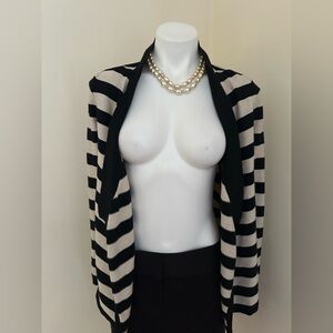 Elegant knit cardigan with black and cream stripes. Ideal for chic layering. Measurements approximately. Sleeves are 23 inches. Armpit to armpit is 17 inches. Length is 23 inches.