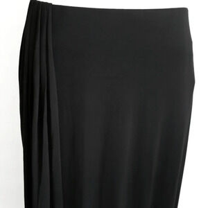 Asymmetrical shape with ruched/pleated detail on one side. Super soft, thin jersey knit. Kickpleat slit hidden under gathered side. Elastic waist. Machine wash, line dry. 95% rayon, 5% spandex
