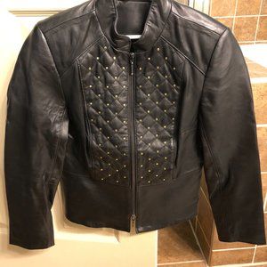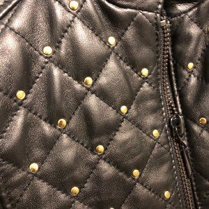WHBM black leather double zip jacket with gold studs on front; Excellent condition (only worn twice); Petite sized XXS; Shoulder: 13.5", Bust: 13", Sleeve length: 20.5", Length in back: 19.5", Length in front: 19"