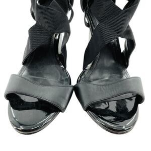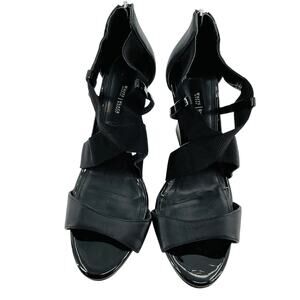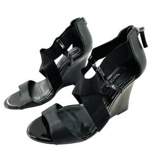 WHBM Black Leather Strappy Career Chic Zip Back Elastic Ankle Wedge Heel 9.5