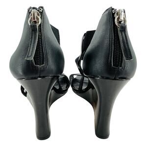 White House Black Market WHBM Black Leather Strappy Career Chic Zip Back Elastic Ankle Wedge Heel