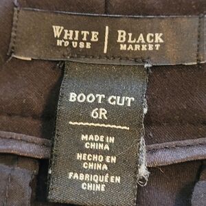 White House Black Market Black dress pants. 68% rayon, 28% nylon, 4% spandex. They have a mid rise and a boot cut. 2 front pockets and 2 back. 2 hook, button and zip fly closure. Heavy quality pair of dress pants. Good condition. Size 6 Regular. Please compare measurements to something similar to ensure fit.
