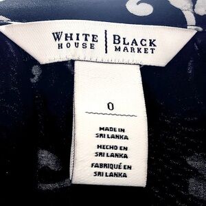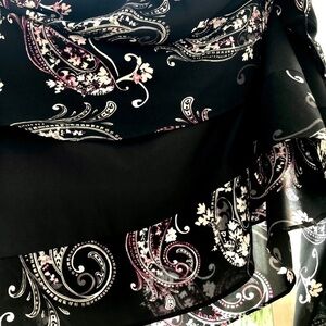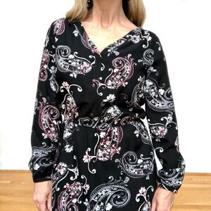 White House Black Market black, pink and white paisley v-neck dress with elastic waist and sheer double layered skirt. In like-new condition.