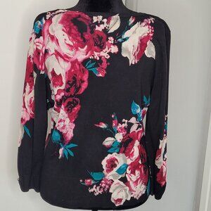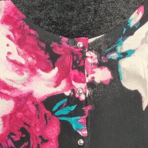 Turn heads in this vibrant White House Black Market button-up cardigan, showcasing a rich floral print in bold pink, ivory, and teal on a sleek black background. The soft, stretch-knit design is finished with shiny silver-tone buttons down the front and on the cuffs. The feminine scoop neckline and 3/4 length sleeves create a flattering silhouette, while the cuff button detail adds a subtle polished touch. Perfect for layering or worn on its own for a statement look.