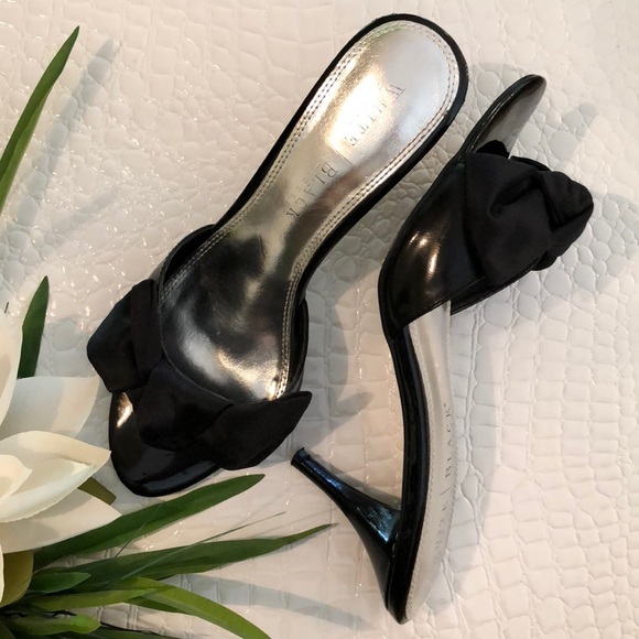WHBM Black Satin Bow Slides w/Patent Heel, Toe EUC