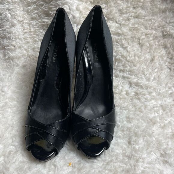 WHBM Black Satin slip on heels pleated front peep toe faux leather trim SZ9M