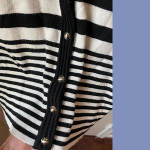 The cardigan has nautical horizontal stripes in black and soft cream, thicker on the top and thinner at the bottom. It has scoop-and-V neckline, three-quarter sleeves, and metal snaps. Please note a few pulled threads on one of the cuffs.