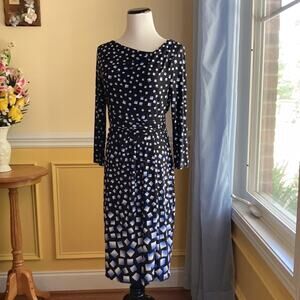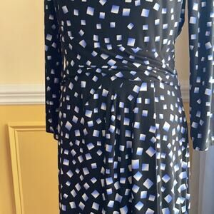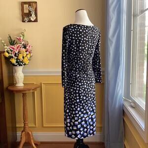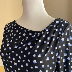 WH/BM Blue & Black Geometric Print Draped Stretch Sheath Dress, Size 4
