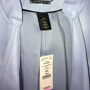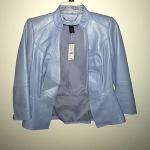 NWT This classy jacket is a dutchess blue with a 3/4 length sleeve. It is made of 100% genuine leather with a 100% Polyester lining. There is a small hook enclosure on the front, and small zippers on the end of the sleeves. Sizing runs large, will fit a xs/small. Offers welcome.