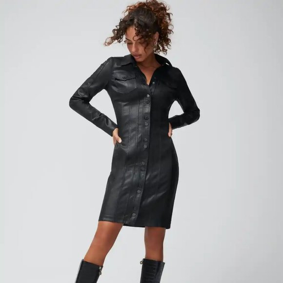 Enchanted with buttons down the front and a fashion-forward collar, the Long Sleeve Coated Denim Dress will be a fall knockout. While it looks like leather, the feel is lightweight and stretchy. Buttoned it's a shirt dress, open it's a jacket. Comfortable to wear all day and stylish to wear into the night.