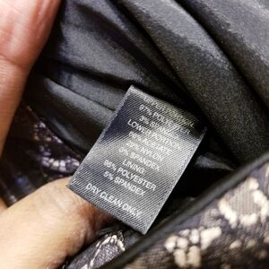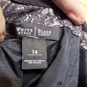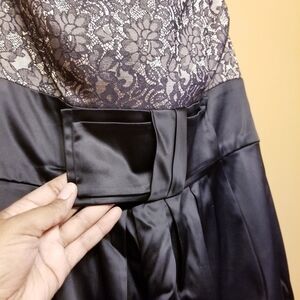 Strapless little black cocktail dress with lace overlay by White House Black Market, size 14. Color behind lace is gold/brass. Attached bow in the front; dress is lined and has hang straps. Fabric: 97% polyester and 3% spandex. Excellent pre-owned condition; no flaws (just a little wrinkled).