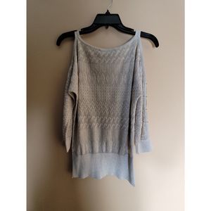 Cold shoulder sweater with metallic gold threads and keyhole openings up the sleeves.