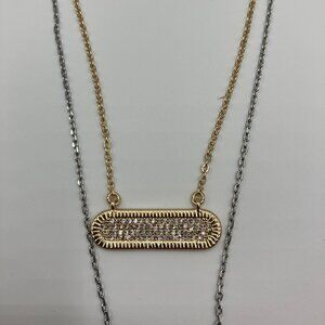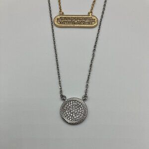 Another classic-yet-contemporary necklace from White House Black Market! 2 options in 1 - a shorter gold tone strand with a bar charm decorated with gold crystals, a longer silver tone layer with a circle charm adorned with white crystals. Gold WHBM stamped tag, converter strand with lobster clasps. Wear each strand separately or combined to complete any outfit.