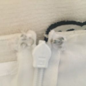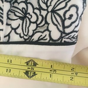 White House Black Market 100% cotton strapless dress, size 4. The dress is white with the look of black embroidery with a cutout detail. The dress is lined so there is lining behind the cutouts. The dress has a side zipper that is working perfectly and a hook and eye closure that is intact and shown in picture. The dress is dry clean only. The dress is in perfect condition and has been lightly worn. The dress is from a clean, smoke-free home.