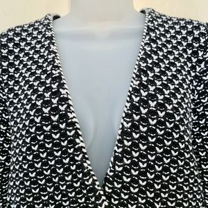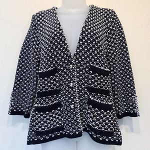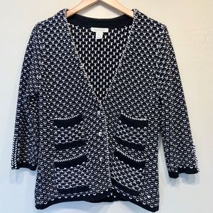 White House Black Market Crochet Chunky Knit V-Neck Silver Button Down 3/4 Sleeve 4 Pocket Cropped Twisted Detailed Hem Heavy Weight Sweater Dark Academia Cardigan Blazer Jacket