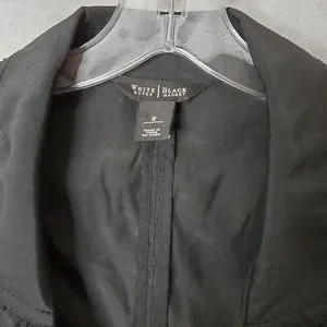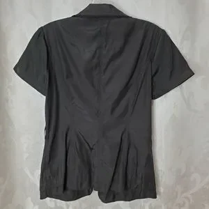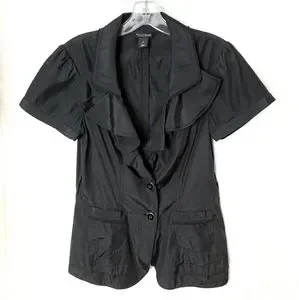 White House Black Market ruffle detail blouse. Ruffles around neckline, collar, and pockets. Fitted. Black and silver buttons. Short sleeve. Shine. No stretch. Blazer. Jacket.