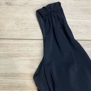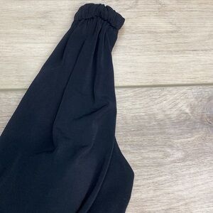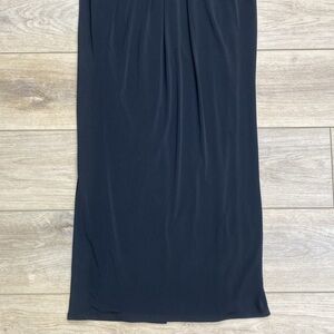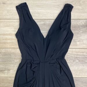 Classic minimalist solid black floor length sleeveless V neck gown by White House Black Market. A timeless formal dress that’s perfect for events and parties. The deep V neckline is shirred at the empire waist for flattering draping down the front. The fabric is stretchy and slinky and moves beautifully. The wide straps cascade down for a deep V back with zipper closure. The back features a dramatic slit for comfortable wear. The chest has pads for practical wear. In excellent condition, Size 0