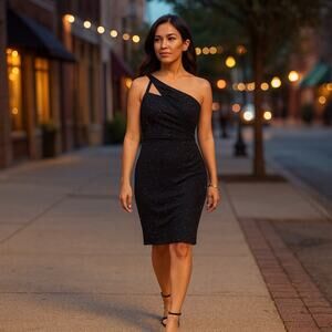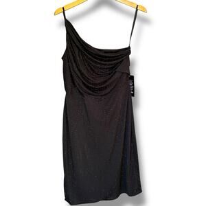 WHBM Dress NWT Size 8 Petite One Shoulder Black Sparkle Cocktail Midi Length
