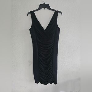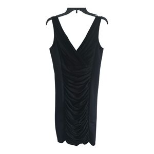 WHBM Dress Women Sz 10 Black Sleeveless V-Neck Midi Ruched Cocktail