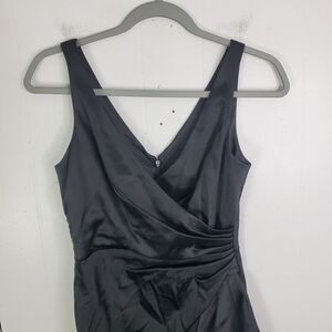 Get ready to turn heads at any event with this stunning White House Black Market dress. The dress features a flattering V-neckline and a sleeveless design, with an empire waistline that enhances your curves. The gathered side flaps add a touch of elegance to the dress, making it perfect for a party or cocktail occasion. Crafted from a combination of nylon, spandex, and acetate, this satin black dress is both comfortable and stylish. It has a zip closure and is dry clean only, ensuring that the dress retains its quality for years to come. This pencil dress is perfect for any season, whether it's summer, fall, or spring. Don't miss out on the chance to add this classic piece to your wardrobe.