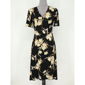 WHBM Dress Womens 4 Black Yellow Floral Stretch Knit Faux Wrap Fit n Flare