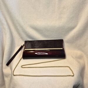 Gorgeous port wine color patent leather and calf hair with gold-tone trim and metal shoulder strap (detachable)