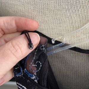 This lovely black and blue sleeveless top is a lightweight net tank, embroidered and sequined, with an included black camisole. It has strap clips to hold your camisole/bra straps in place.