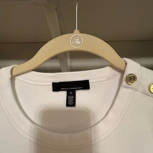 Sleek white tee with button accents on the shoulder. Ideal for casual elegance.