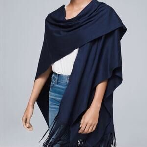 White House Black Market Fringe Ruana Wrap Poncho, Navy Blue, One Size.