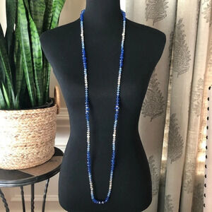 WHBM Flapper Length Long Glass Beaded Necklace Blue Clear Faceted Crystal Accent