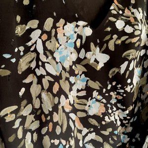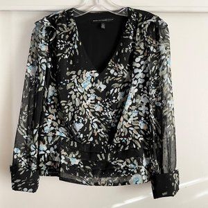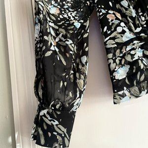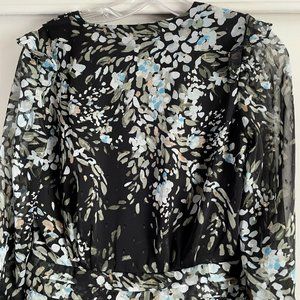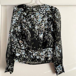 WHBM Floral Metallic Sheer Print Blouse Sz 2 Balloon Sleeve V Lined Black/Blue
